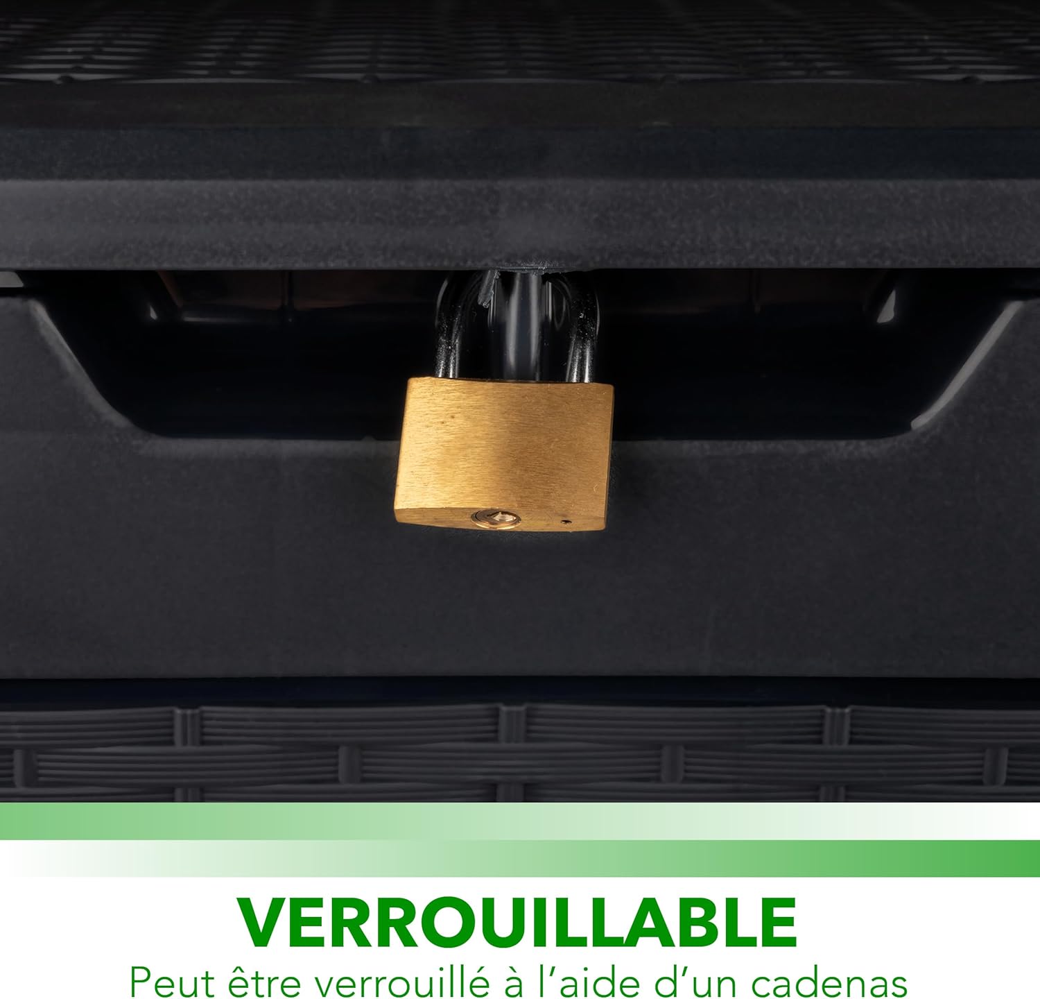 COFFRE EXTÉRIEUR CADENAS – La boite rangement exterieur de jardin peut être verrouillée à l’aide d’un cadenas afin de préserver la sécurité de vos biens extérieurs du coffre terrasse exterieur.