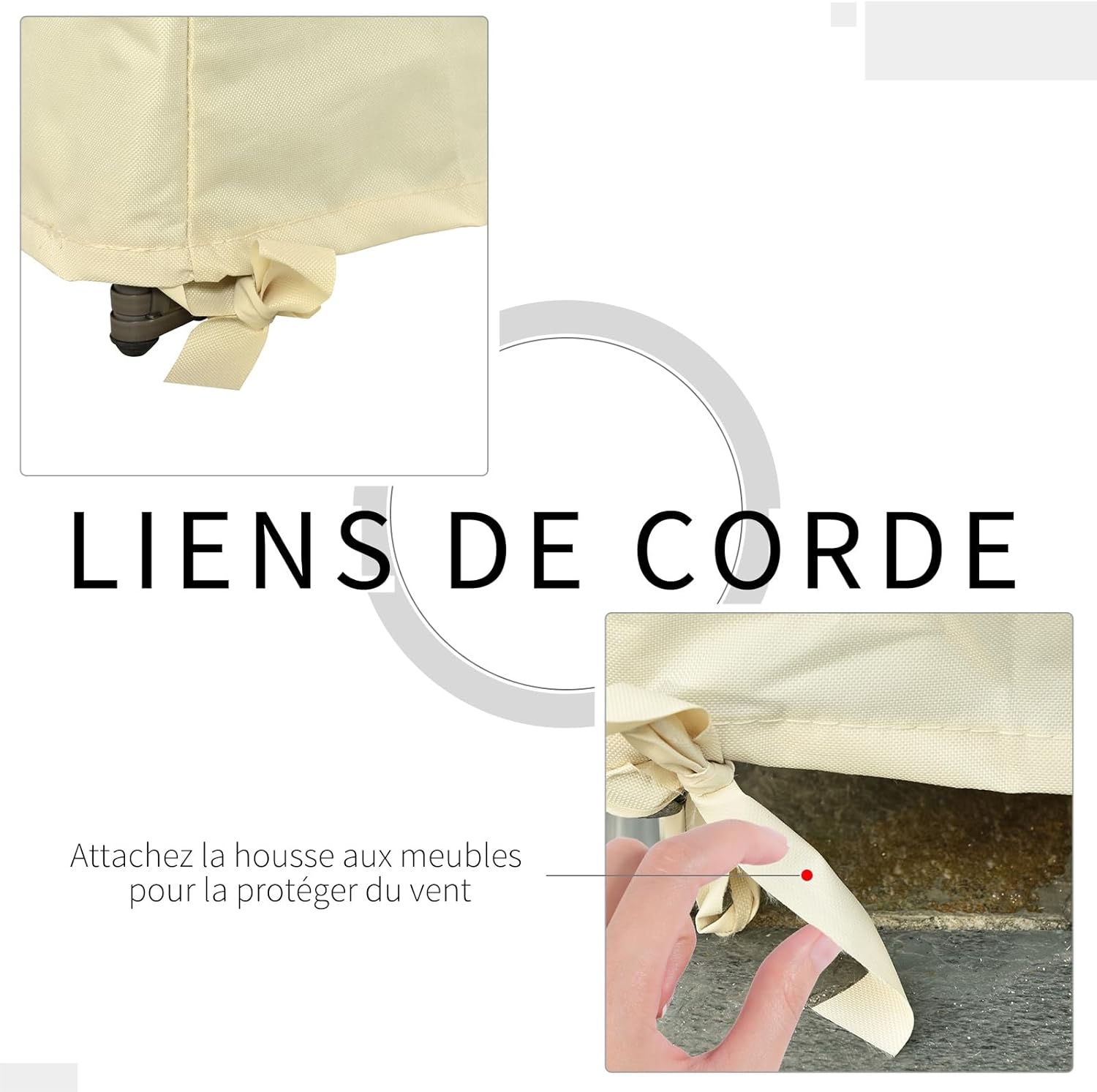 Housse pour meubles de jardin fabriquée en tissu Oxford haute densité 600D résistant Revêtement en PVC imperméable Idéale pour couvrir un canapé 2 places, des chaises, bancs, barbecues, etc… Efficace pour protéger votre mobilier de jardin contre les aléas climatiques Parfait maintien de la housse avec 4 attaches Nettoyage facile
