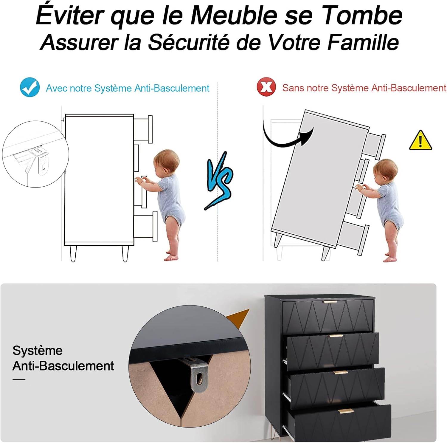 【Espace de Rangement à 4 Tiroirs:】 Notre commode présente 4 grands tiroirs de 52,5 x 28,5 x 10 cm, cela vous permet d’organiser les objets quotidiens comme vêtements, documents, appareils électroménagers etc. correctement et régulièrement dedans. Porte la bonne propreté à la maison.