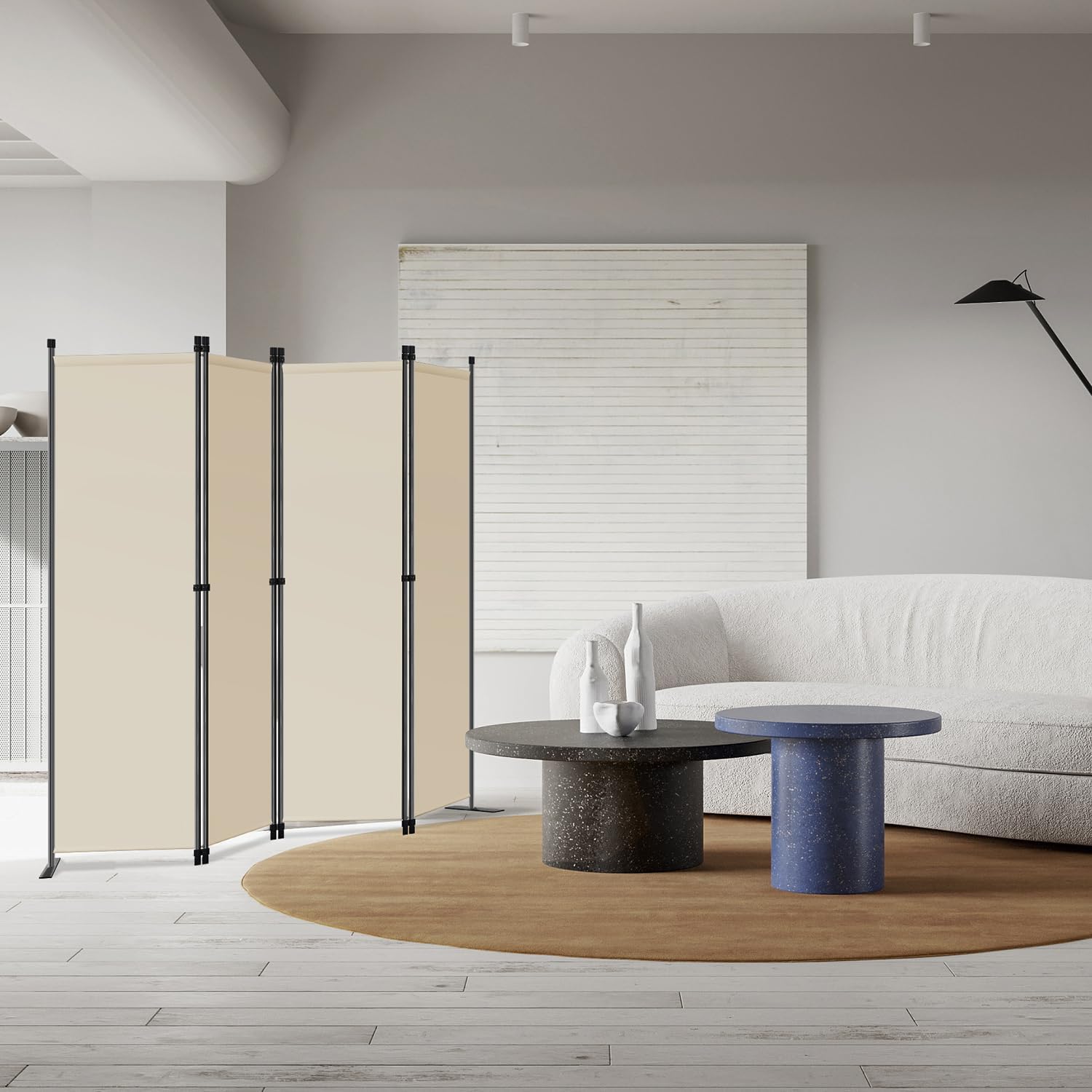 Description du produit moderne gris foncé à plusieurs panneaux, illustré à côté d'un canapé blanc incurvé et de tables d'appoint cylindriquesmoderne gris foncé à plusieurs panneaux, illustré à côté d'un canapé blanc incurvé et de tables d'appoint cylindriques