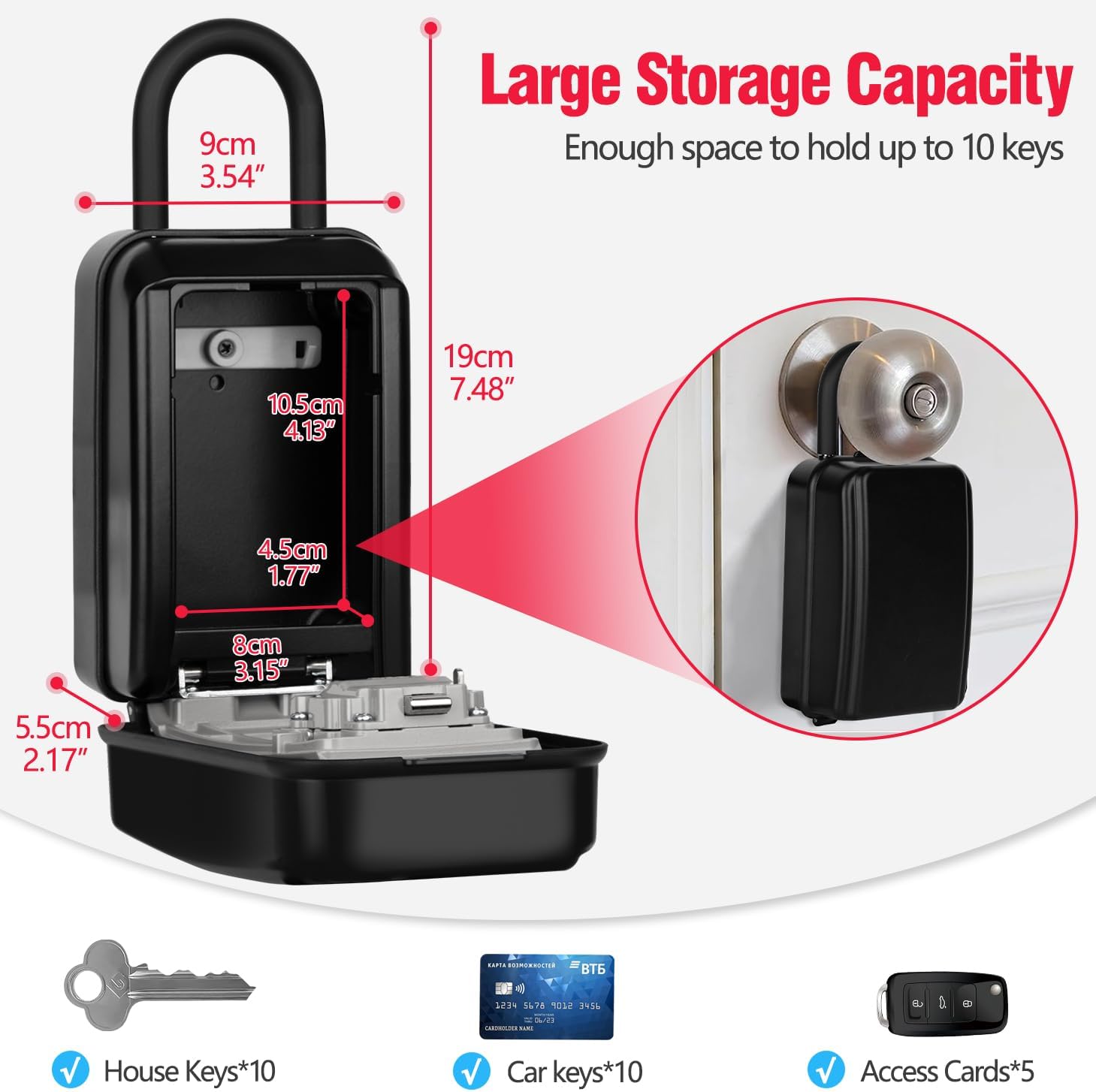 EXTRA LARGE : Avec un espace de stockage interne de 10,7*7*4,2 cm, soit environ 300 ml, notre porte-clés a une grande capacité de stockage pour une variété d’objets, des clés de la maison et du bureau aux cartes de crédit, à l’argent liquide et même aux grands porte-clés. Que vous souhaitiez protéger vos objets de valeur contre le vol, la perte ou l’égarement, nos coffres à clés vous apporteront la tranquillité d’esprit !