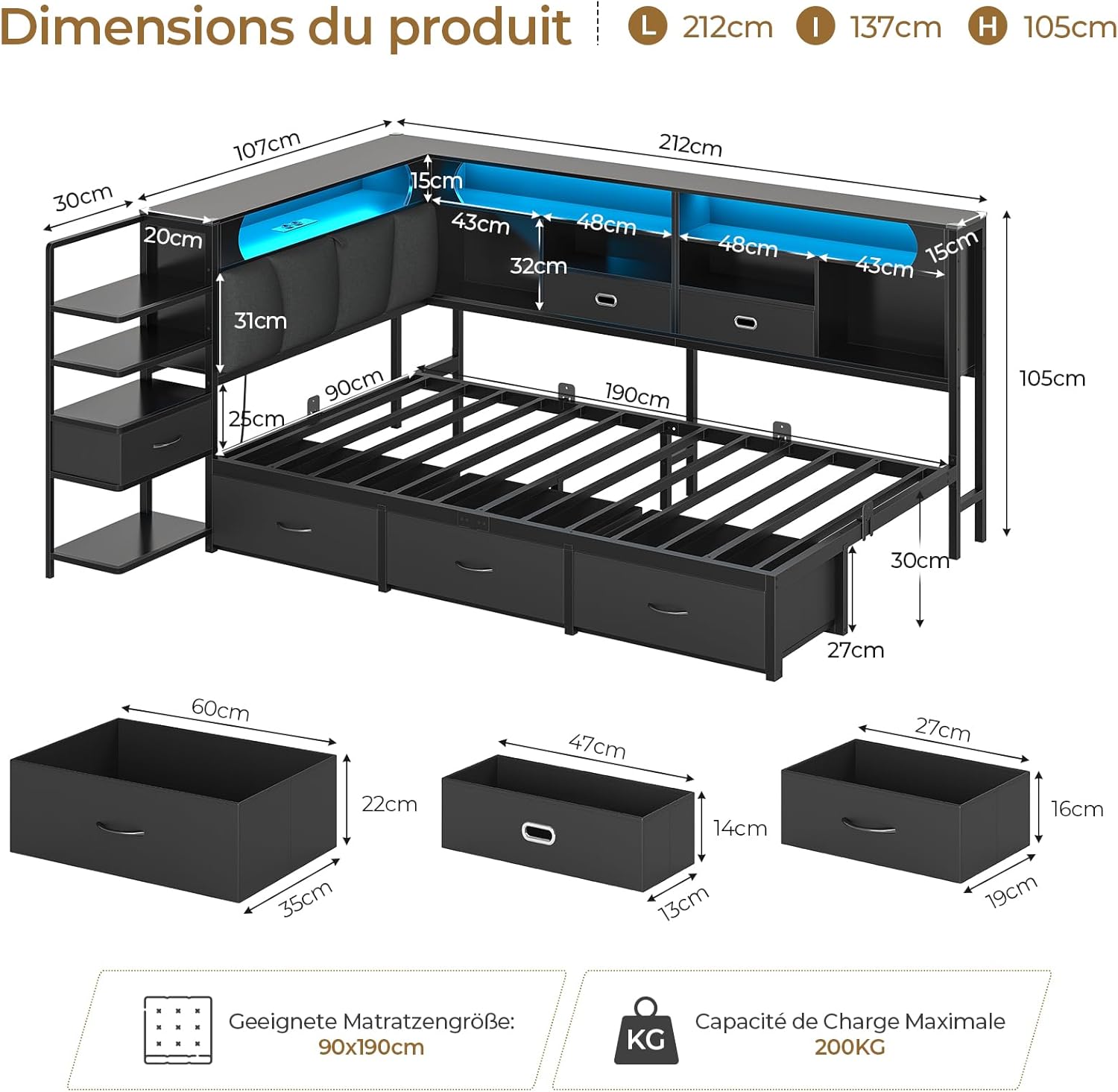 【Solution L pour Petits Espaces : Gain de Place Maximum】 Transformez les coins inutiles en espace de vie ! Notre lit banquette 90×190 en L épouse parfaitement les angles. Montable à gauche ou à droite, il s’adapte à votre agencement. Votre solution astucieuse pour un studio moderne ou le royaume de votre enfant.