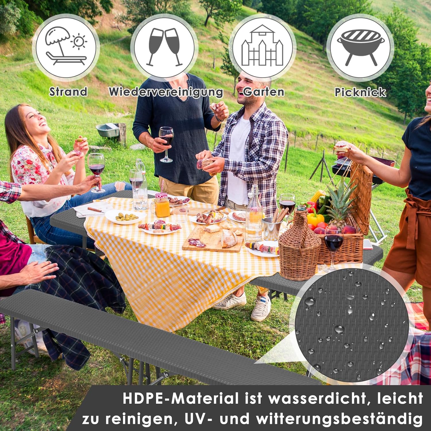 Excellent matériau : le cadre du Ensemble Table et Bancs est constitué de tuyaux en acier revêtus de poudre, garantissant la robustesse et la stabilité du Table de Jardin. La surface est en polyéthylène haute densité (HDPE), à la fois résistant aux UV, aux intempéries et à l’eau pour un entretien facile.