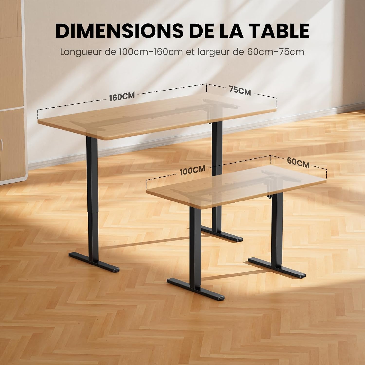 Taille de la table recommandée : convient aux tables d’une longueur de 100 à 160 cm et d’une largeur de 60 cm à 76 cm. Longueur de la barre transversale réglable : 90-135 cm. Plage de réglage de la hauteur : 72-118 cm.