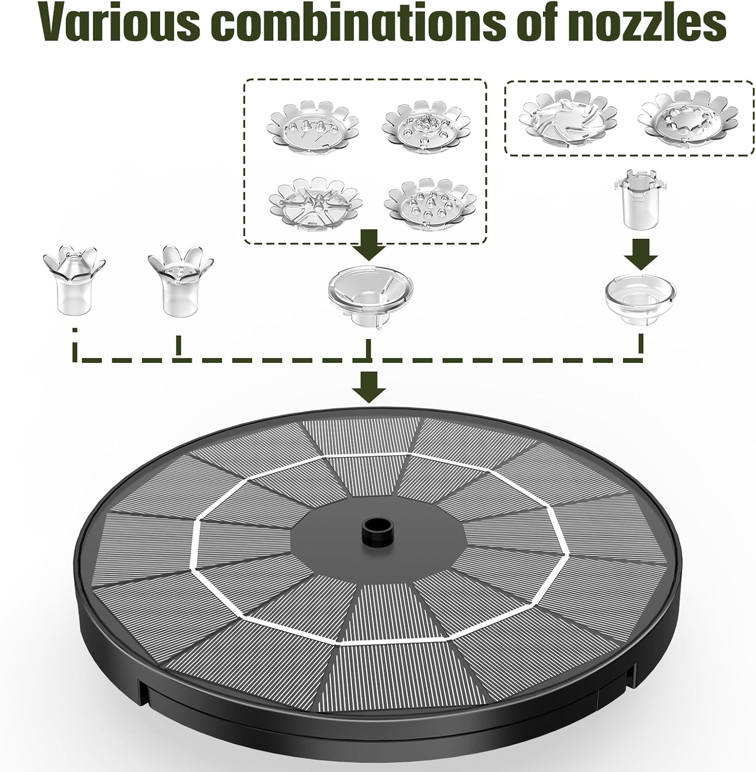 【Plusieurs buses】Cette fontaine solaire flottante comprend deux buses rotatives, quatre buses à double couche et quatre buses verticales. Vous pouvez utiliser différentes buses selon les besoins et les situations. Ainsi, vous pourrez facilement profiter de nombreux jeux d’eau fascinants et des adorables animaux qu’ils attirent.