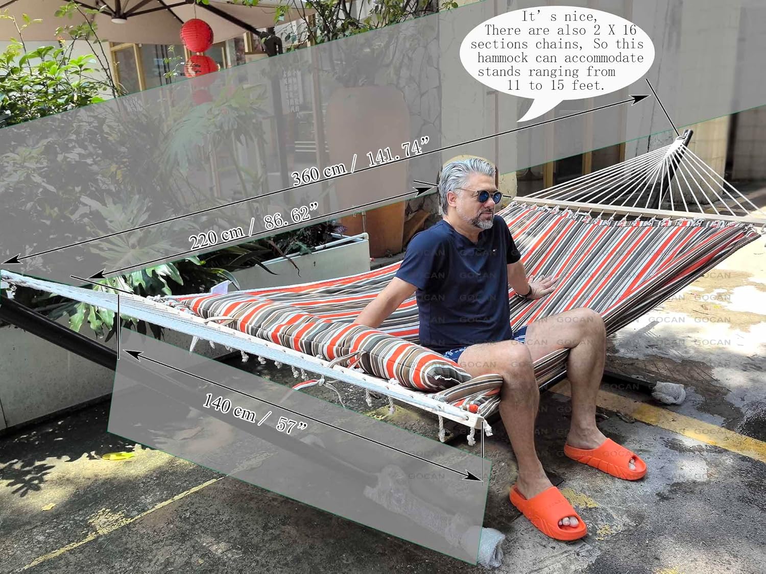 Plus grand et plus long: les hamacs en tissu matelassé peuvent accueillir des supports de 12 ‘à 15’. D’un anneau à l’autre, il mesure 141,73 pouces de long, plus 2 chaînes de 18,89 pouces et 2 crochets en forme de S. Il est facile à installer. La taille est bonne et 2 personnes peuvent s’adapter facilement. Il est parfait pour votre jardin.