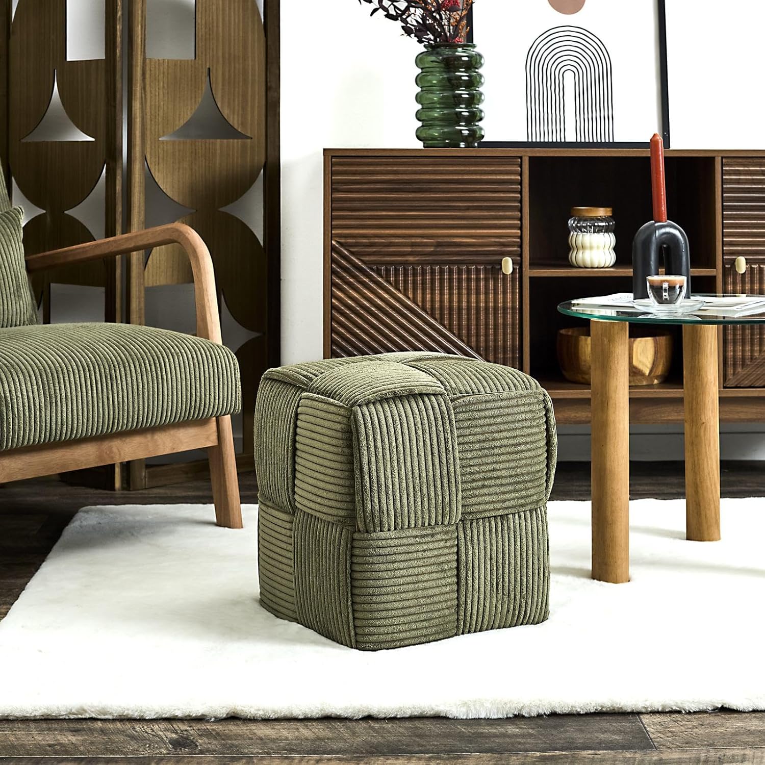 Dimensions compactes : Avec des dimensions de 36x38x36 cm, ce pouf s’intègre parfaitement dans les petits espaces tout en offrant une couleur verte rafraîchissante qui égaye votre intérieur, apportant une note de modernité sans encombrer votre pièce