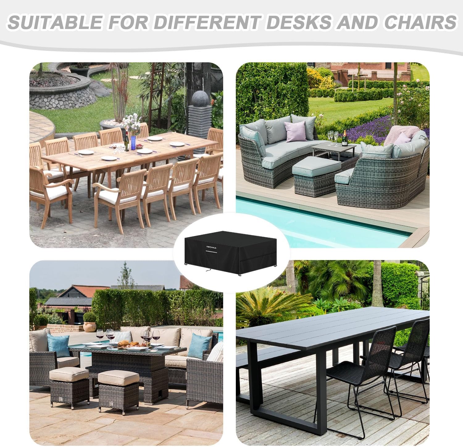[Matériau de haute qualité] La housse salon de jardin exterieur est fabriquée en tissu Oxford 420D de haute densité avec une doublure enduite de PU qui est imperméable à l’eau, aux intempéries, à la poussière, résistante aux UV et aux déchirures. Le revêtement PU à l’intérieur de la housse est brillant et doux, empêchant les rayures accidentelles sur la surface du meuble