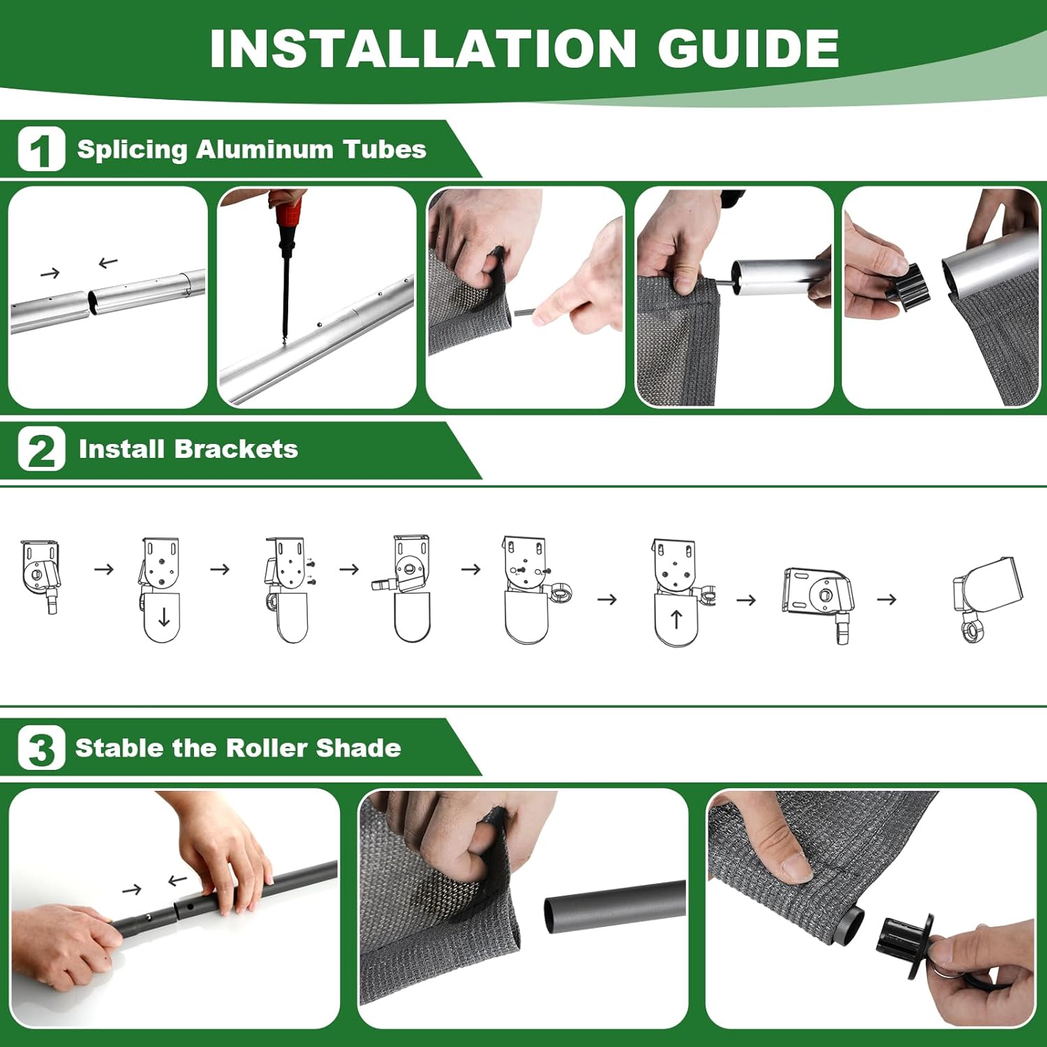 Kit d’installation complet : les stores enrouleurs comprennent tout ce dont vous avez besoin pour une installation en douceur, y compris la poignée de manivelle, les tubes supérieurs et inférieurs, les stores, les cordes élastiques, les supports d’embrayage, les vis, les ancrages en plastique, les rondelles, les bouchons de tuyau et des instructions détaillées. L’installation de stores extérieurs ou de terrasse est simple et indolore, que vous les montiez sur un mur ou un plafond.