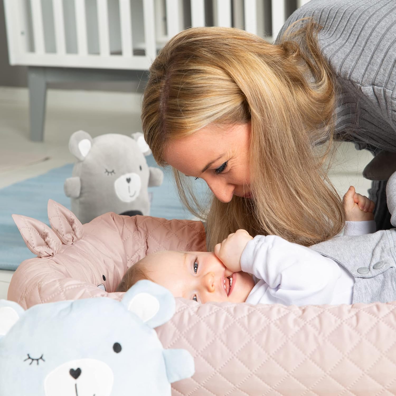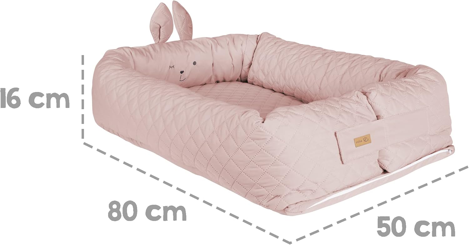 PRATIQUE ET POLYVALENT : le réducteur de lit bébé « roba Style » avec bord surélevé et visage de lapin « Lily » peut être utilisé comme matelas à langer ou cocon douillet sur le canapé