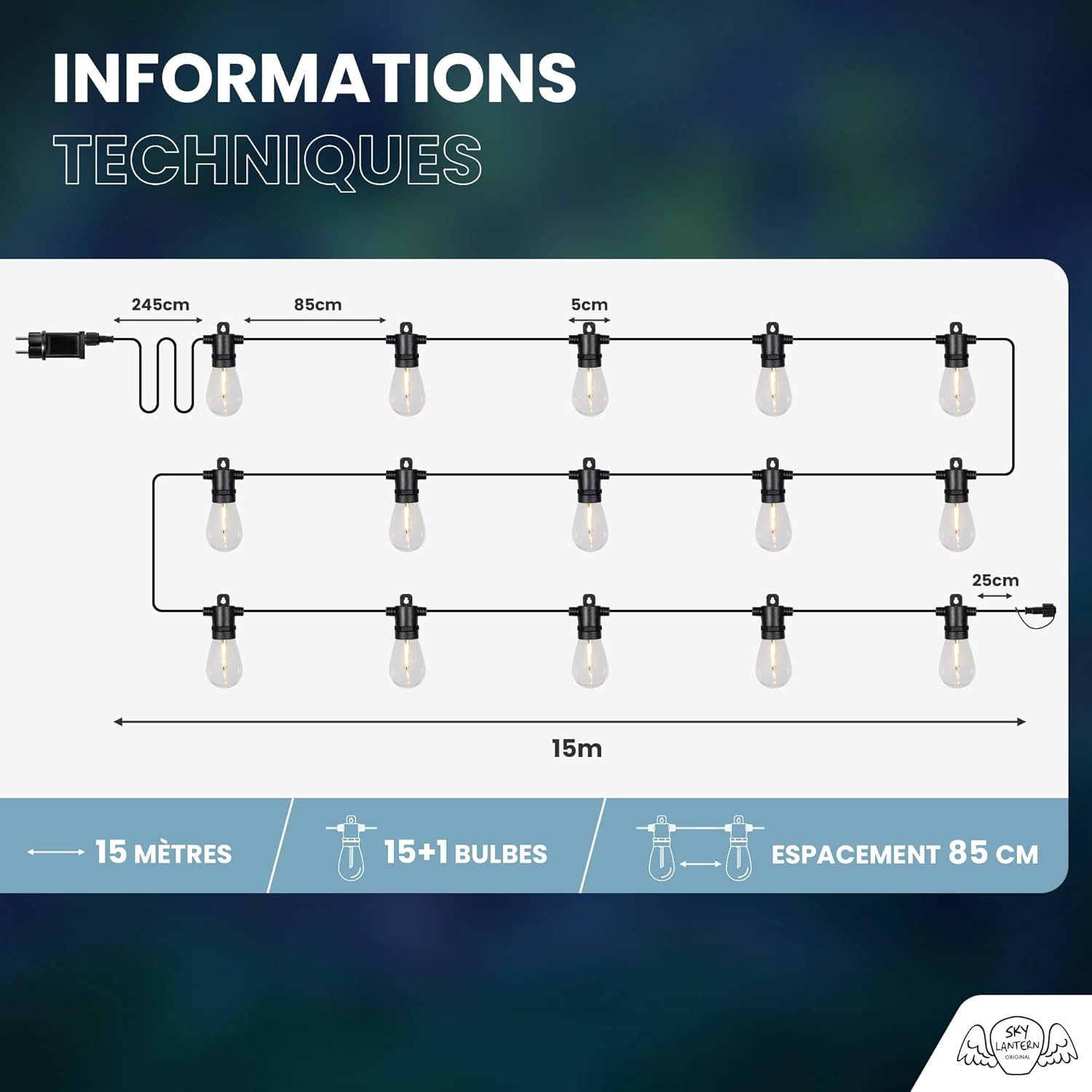 【Télécommande Incluse】Profitez d’une ambiance chaleureuse et personnalisable avec notre guirlande guinguette de 15 mètres, idéale pour illuminer vos espaces extérieurs. Grâce à son variateur de luminosité et sa télécommande, ajustez facilement la lumière selon vos besoins. L’alternative parfaite à la guirlande lumineuse exterieure solaire.