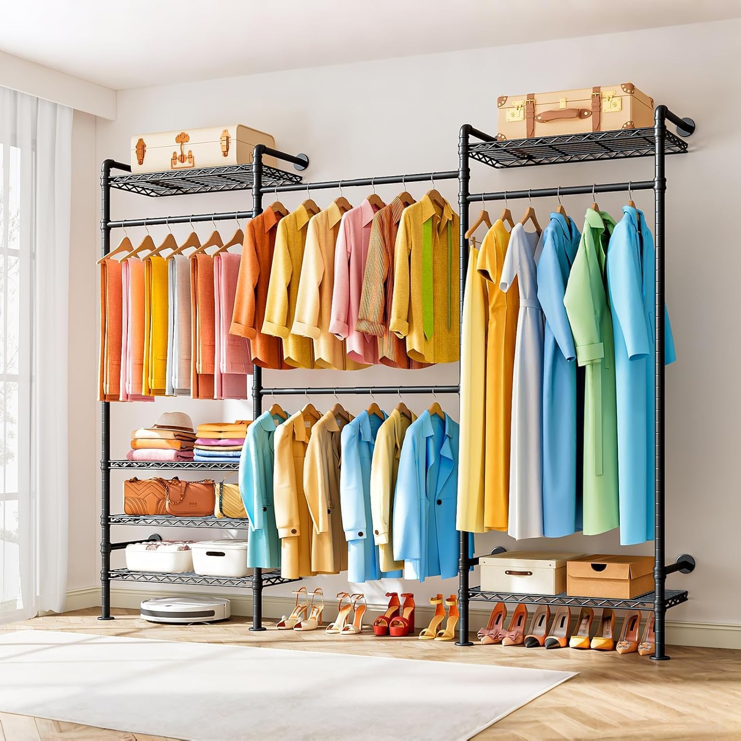 Rangement Multifonctionnel — Ce système de rangement mural répond à divers besoins : penderie murale, porte-vêtements pour chambre, valet pour vêtements, étagère de salle de bain, portant pour buanderie, magasin ou autres espaces.