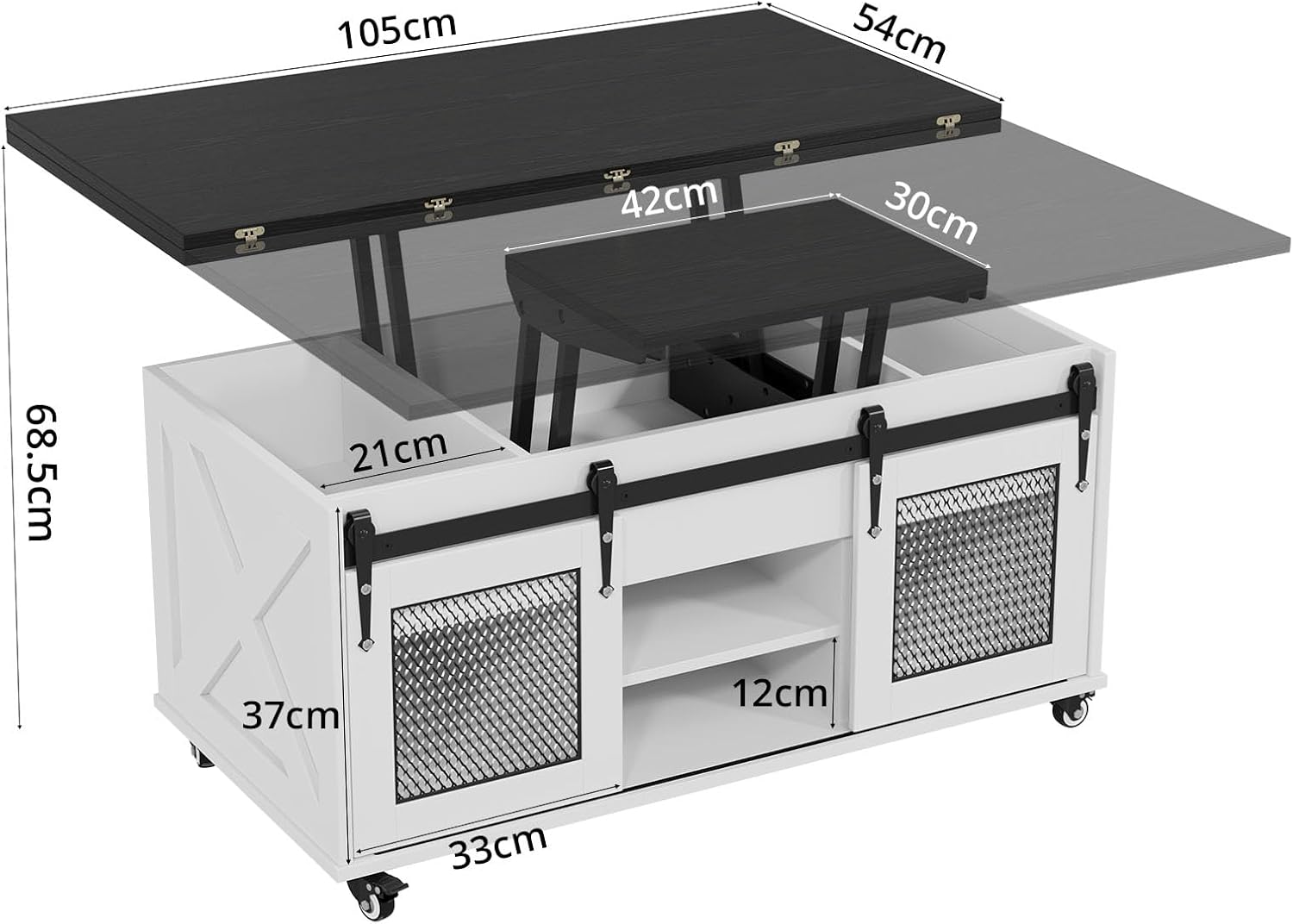 Sous le plateau relevable : 3 espaces de rangement dissimulés + une étagère inférieure ouverte + 2 portes de grange coulissantes