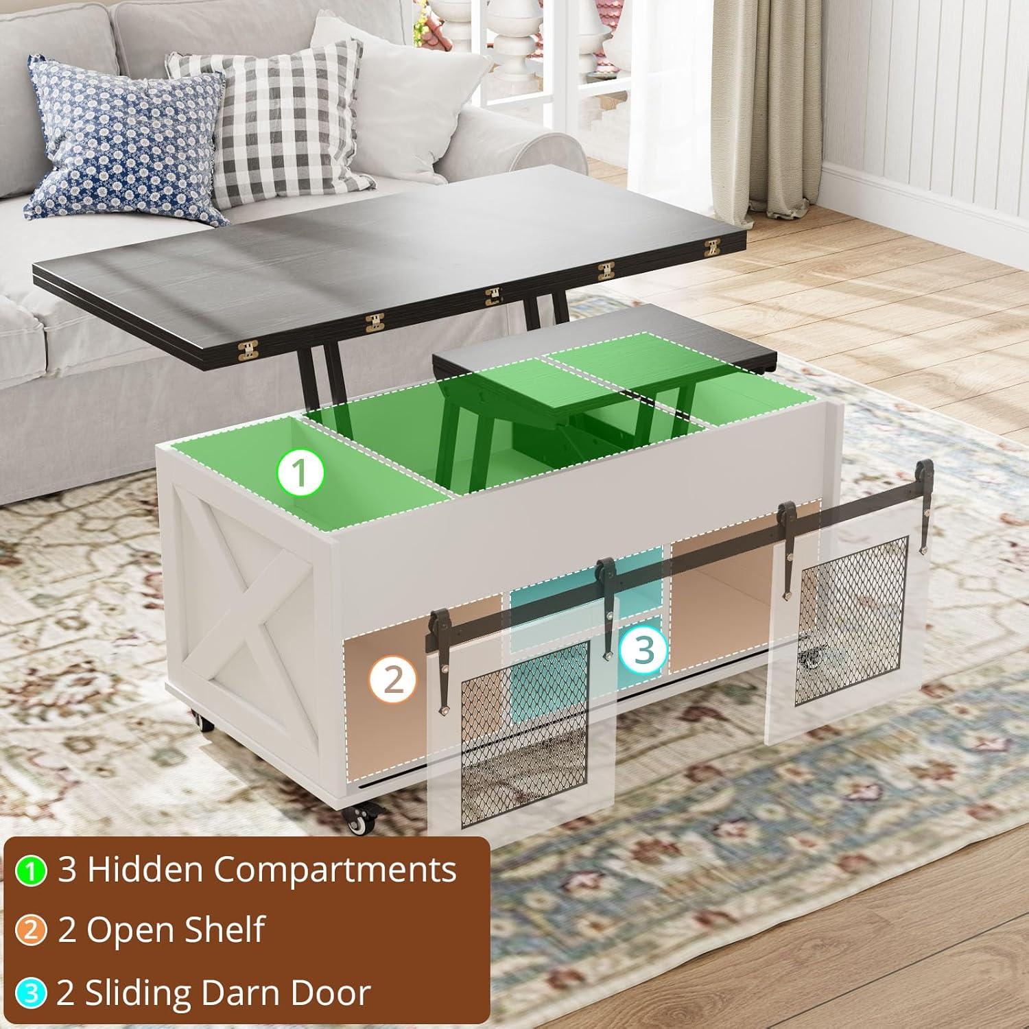 [ESPACE DE RANGEMENT SUPPLÉMENTAIRE]:La table basse à plateau surélevé de 41,3 pouces est dotée de 3 espaces de rangement cachés, de 2 étagères de rangement ouvertes et de 2 portes de grange coulissantes. Elle vous permet de ranger tous les articles ménagers que vous ne voulez pas que vos invités voient, tout en les protégeant de la poussière et en conservant un salon propre et bien rangé.