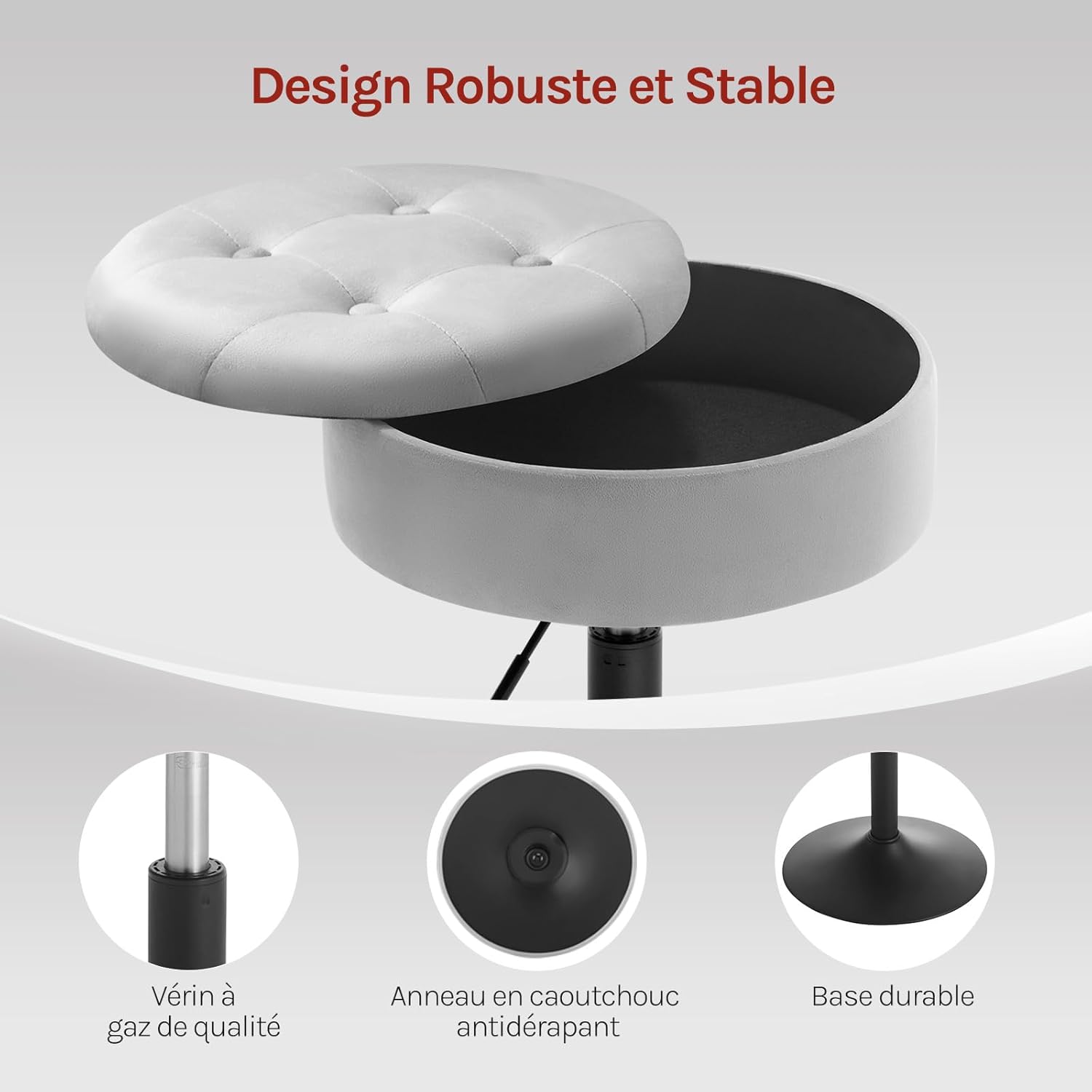 DURABLE & STABLE : Le cadre en métal est robuste pour charger 150kg. La finition le rend facile à nettoyer et antirouille. L’anneau antidérapant sous la base ajoute de la stabilité pendant le pivotement du tabouret, tout en protégeant le sol des rayures