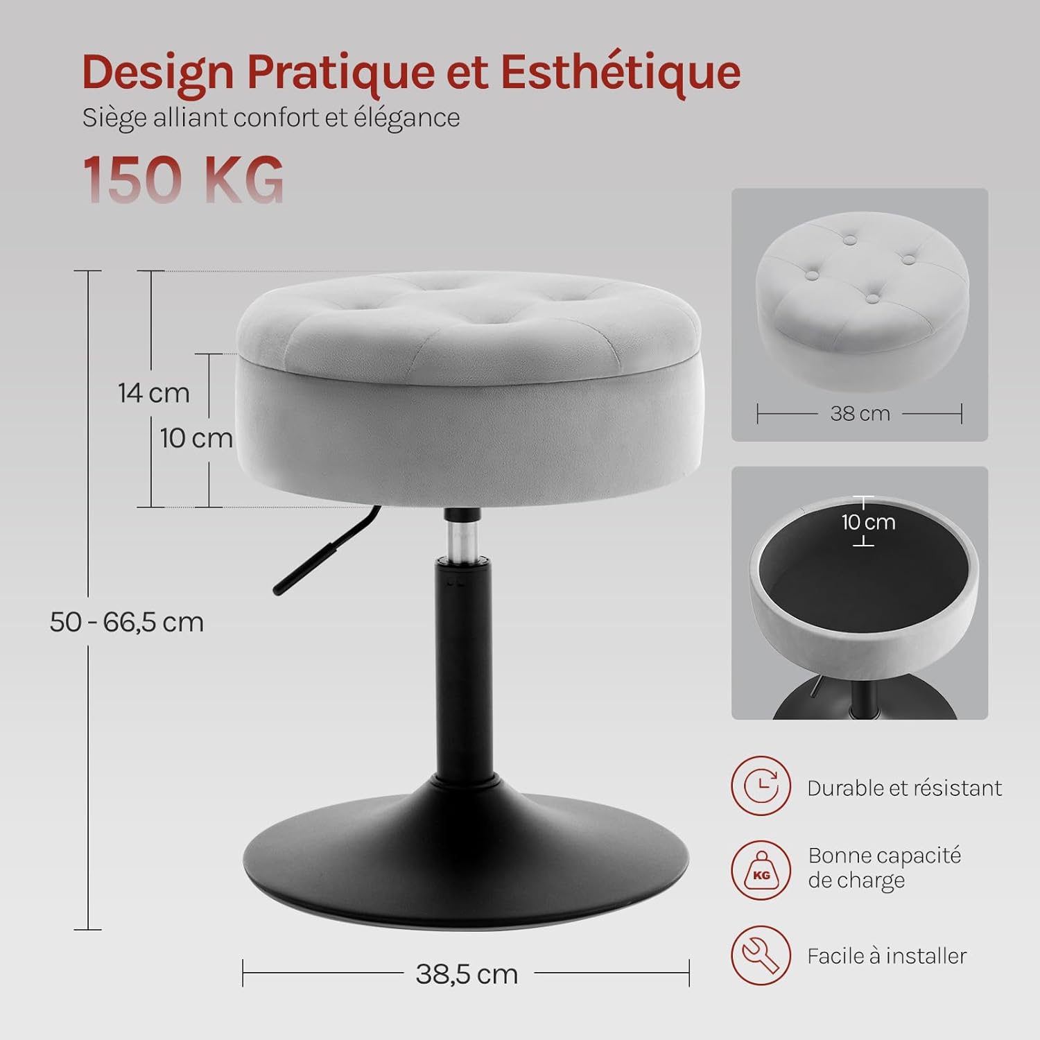 DESIGN PRATIQUE : Le petit tabouret bar est équipé d’un couvercle du siège amovible pour vous permettre de ranger collations, jouets ou produits cosmétiques. Il est léger pour un déplacement facile. La forme ronde vous protège des heurts accidentels